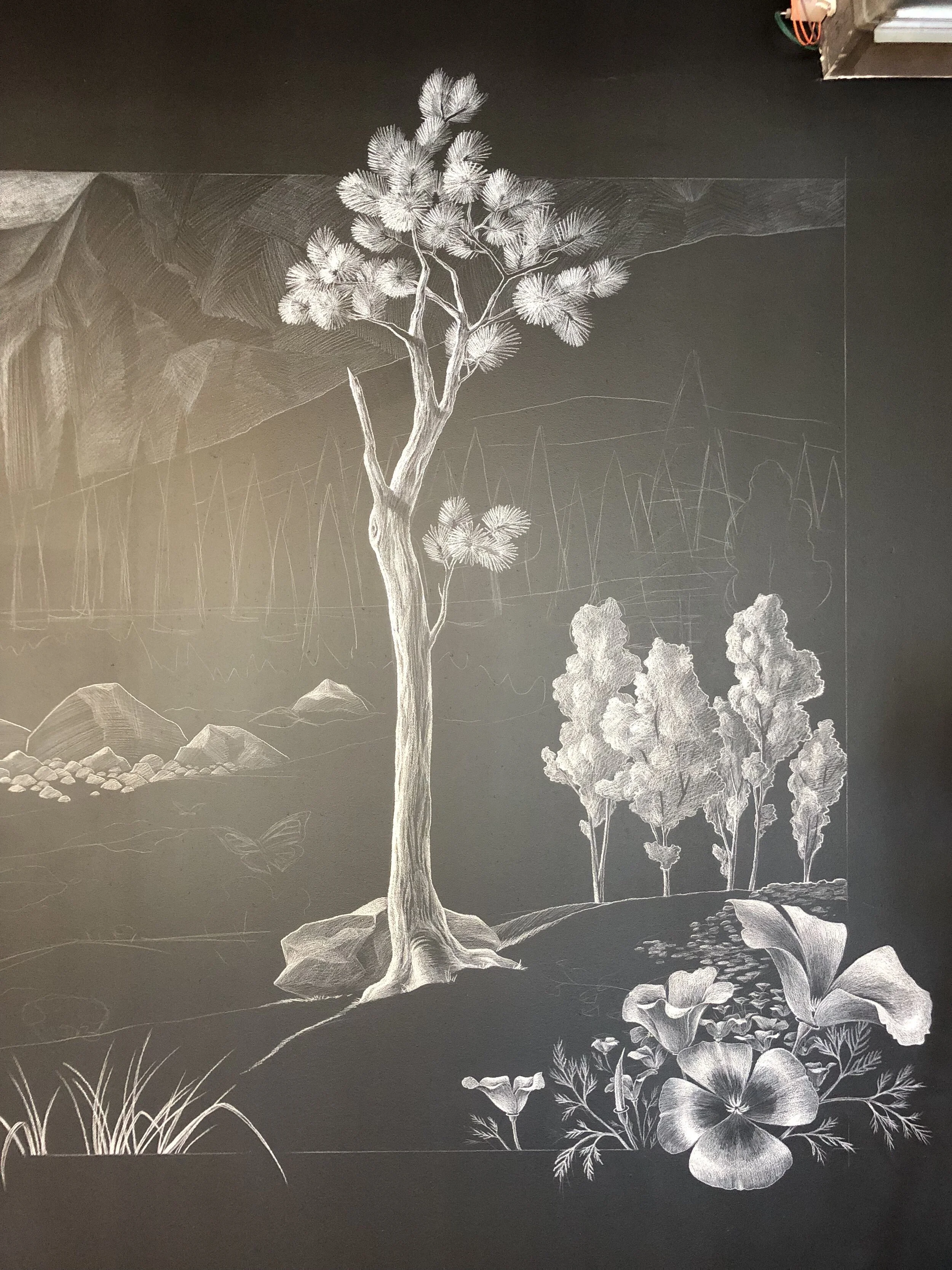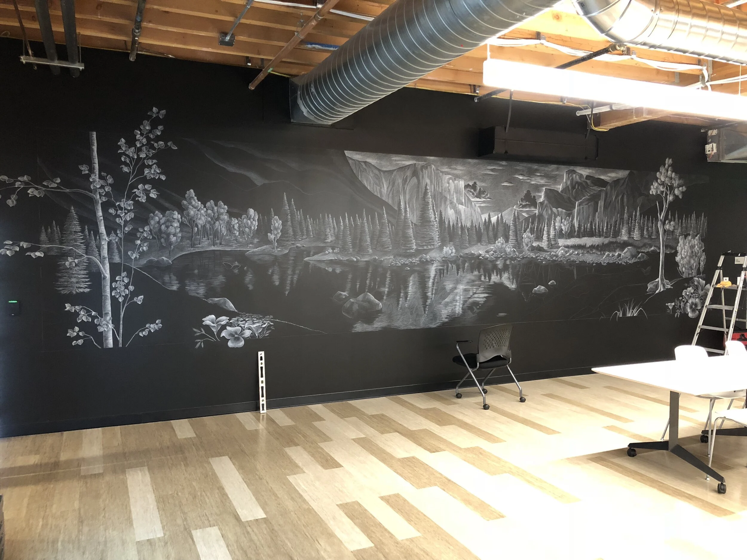 This landscape was an original design based on Yosemite National Park. I used white grease pencil on a painted black wall in the company’s lunchroom. Grease pencil (also called China marker) is a dust-free, permanent solution for those looking for a “chalk” mural. The entire mural was drawn by hand and it took me 5 days to complete.