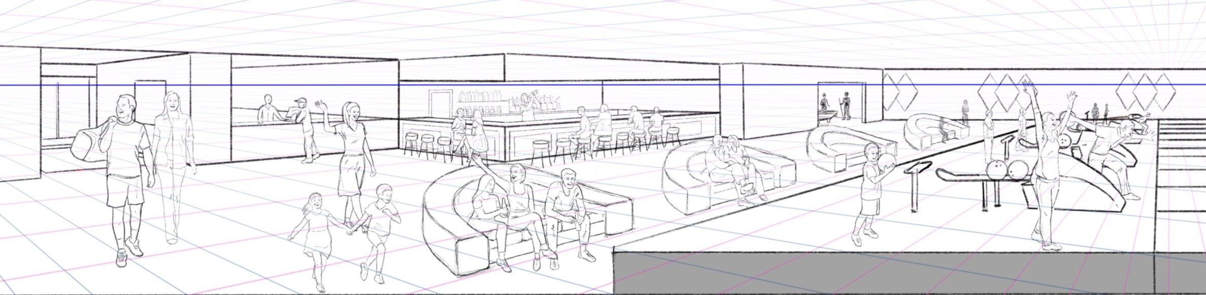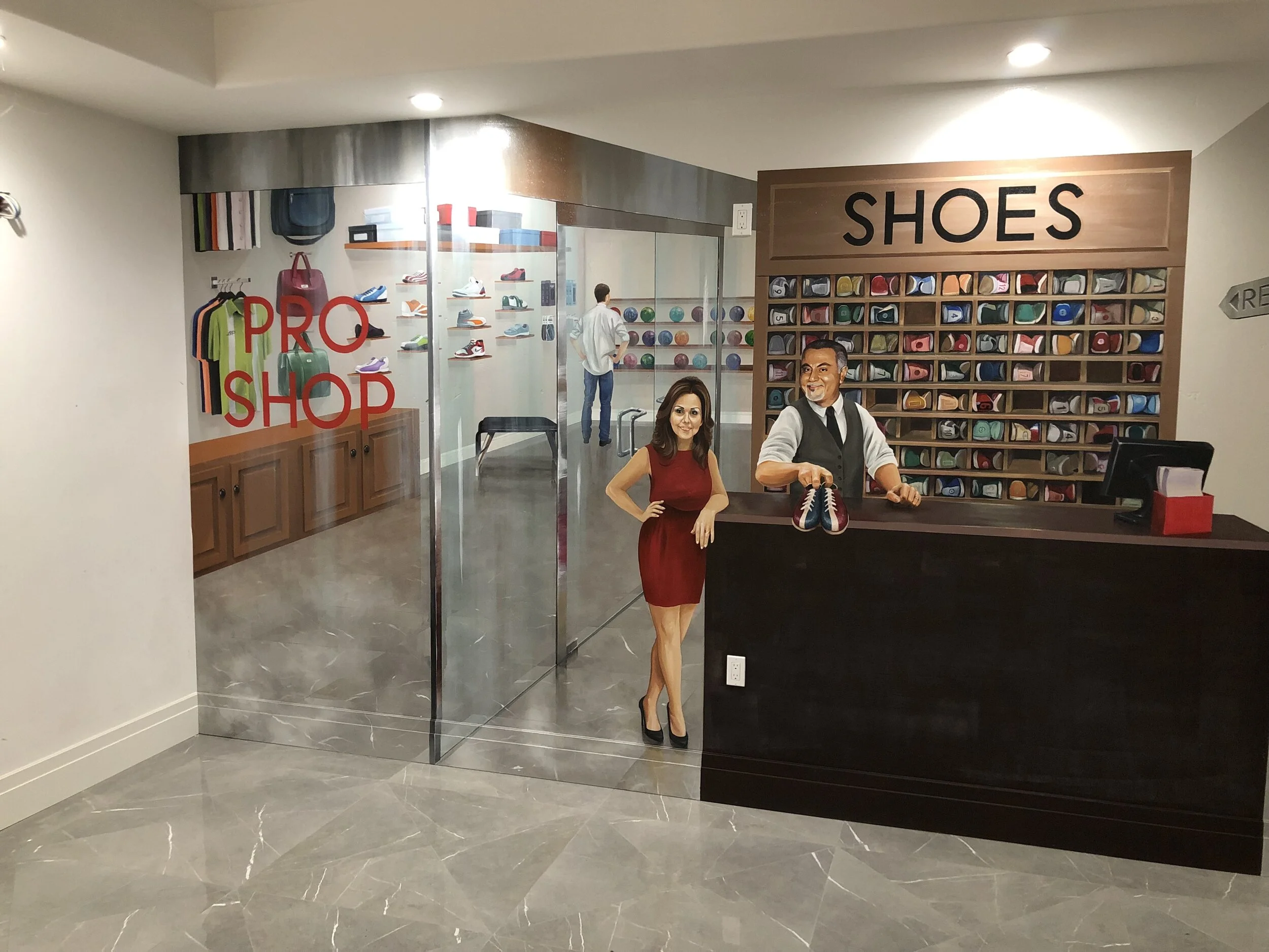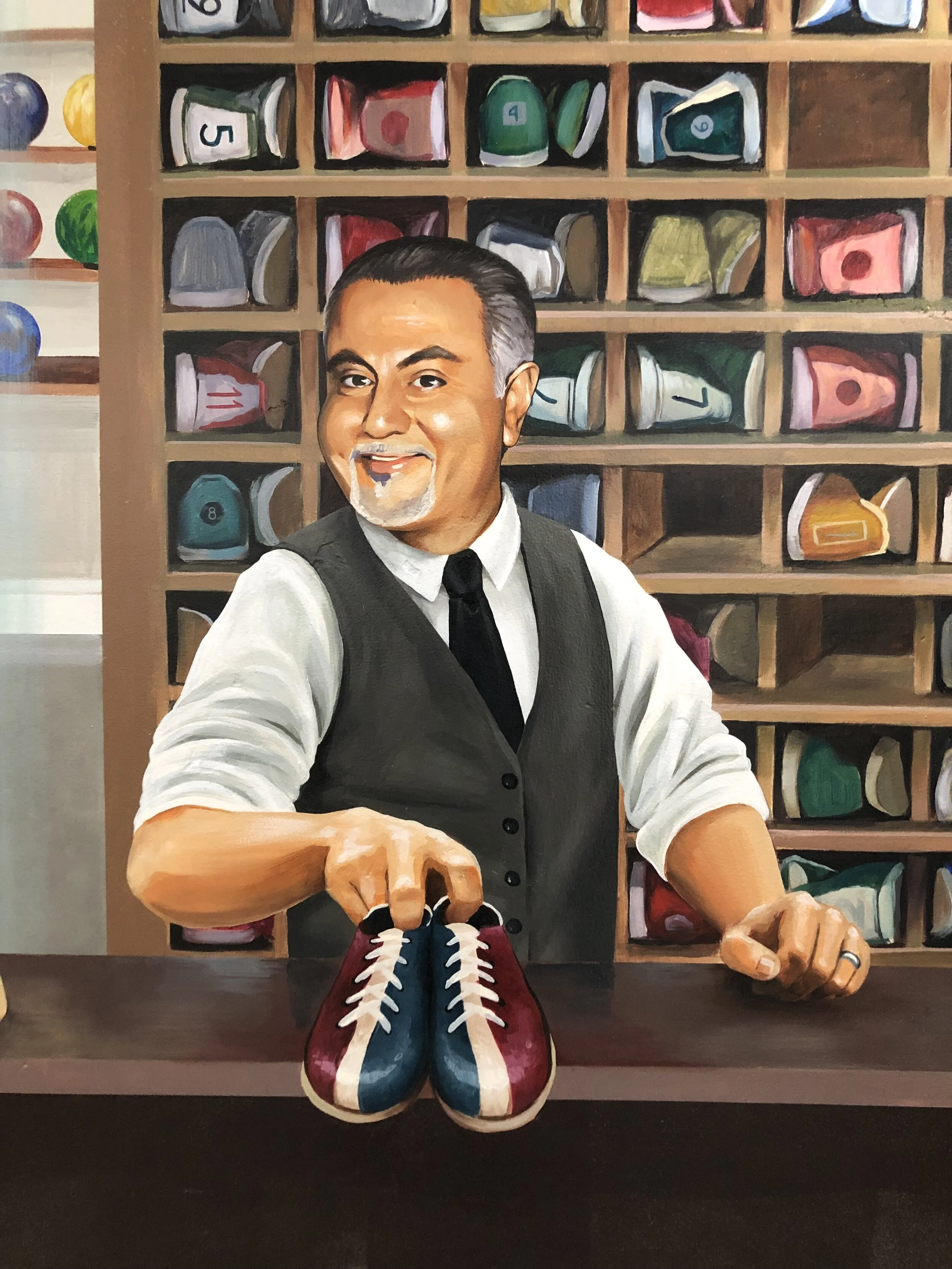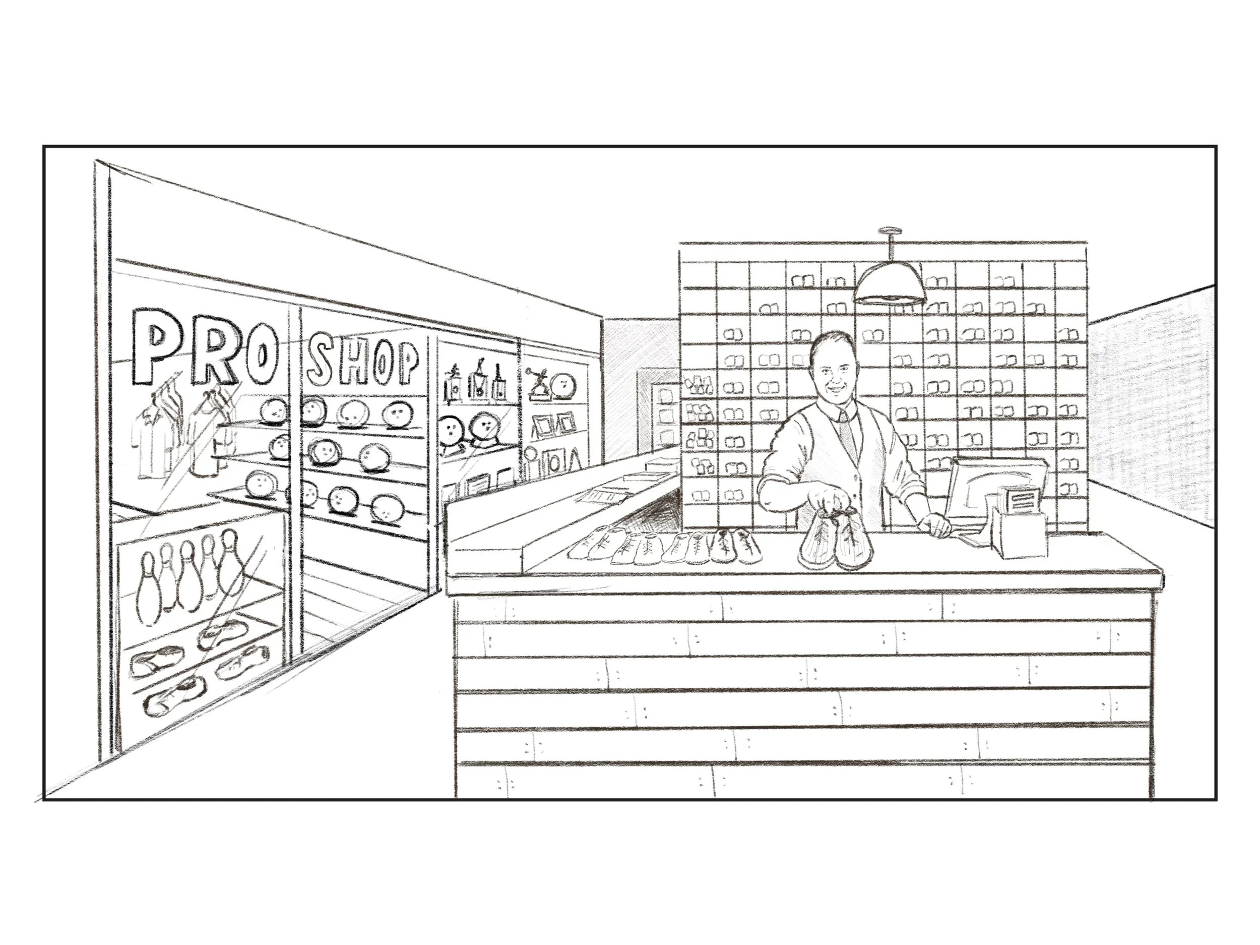 An actual shoe rack will be placed in front of the painted shoe rental desk.